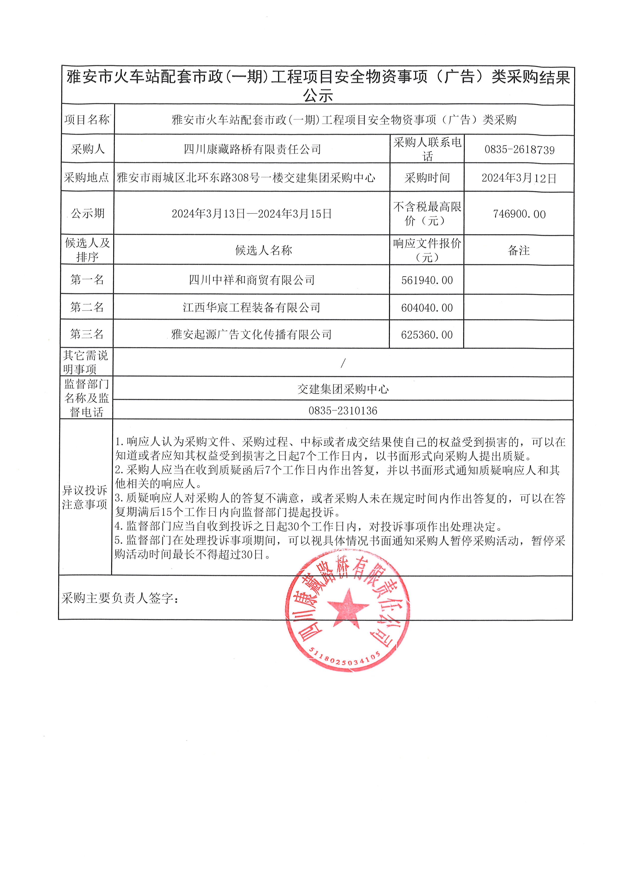 四川康藏路橋有限責任公司雅安市火車站配套市政(一期)工程項目安全物資(廣告)采購結果公示