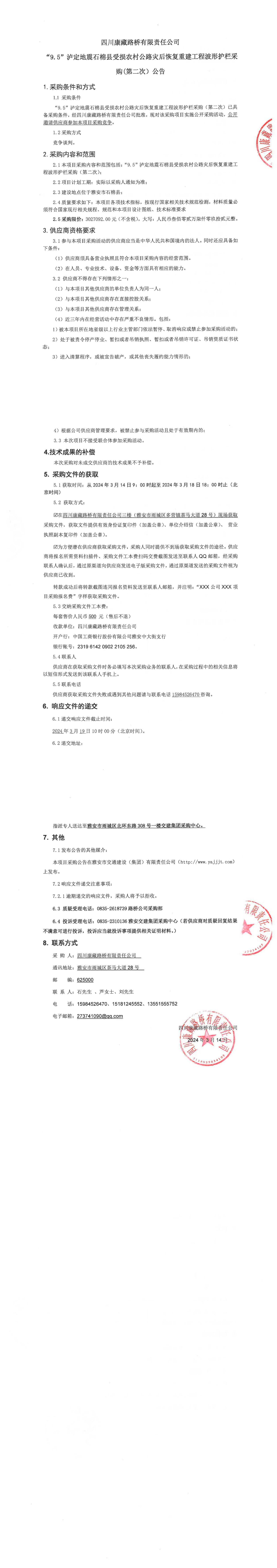 四川康藏路橋有限責(zé)任公司“9.5”瀘定地震石棉縣受損農(nóng)村公路災(zāi)后恢復(fù)重建工程波形護(hù)欄采購(gòu)(第二次)公告
