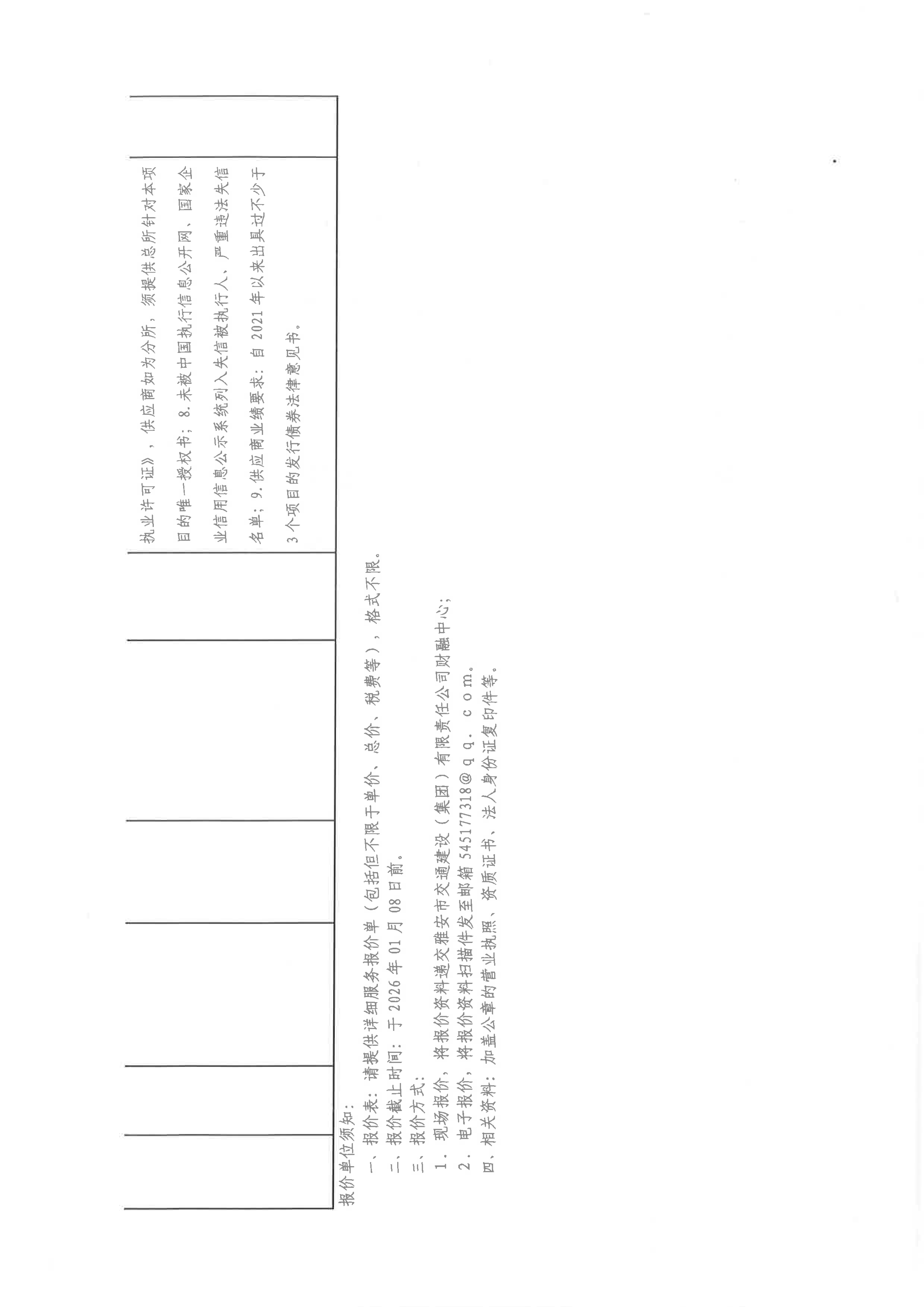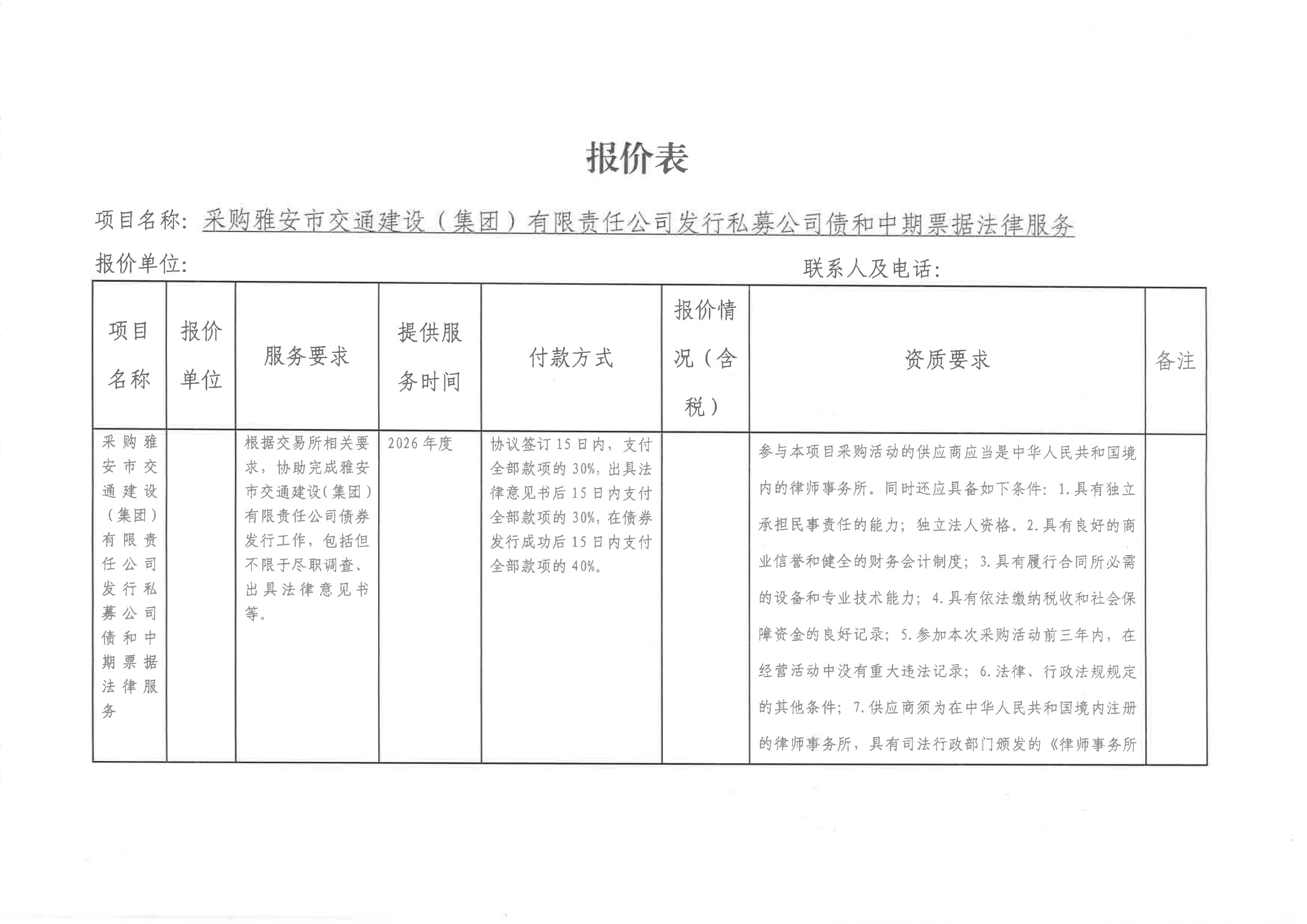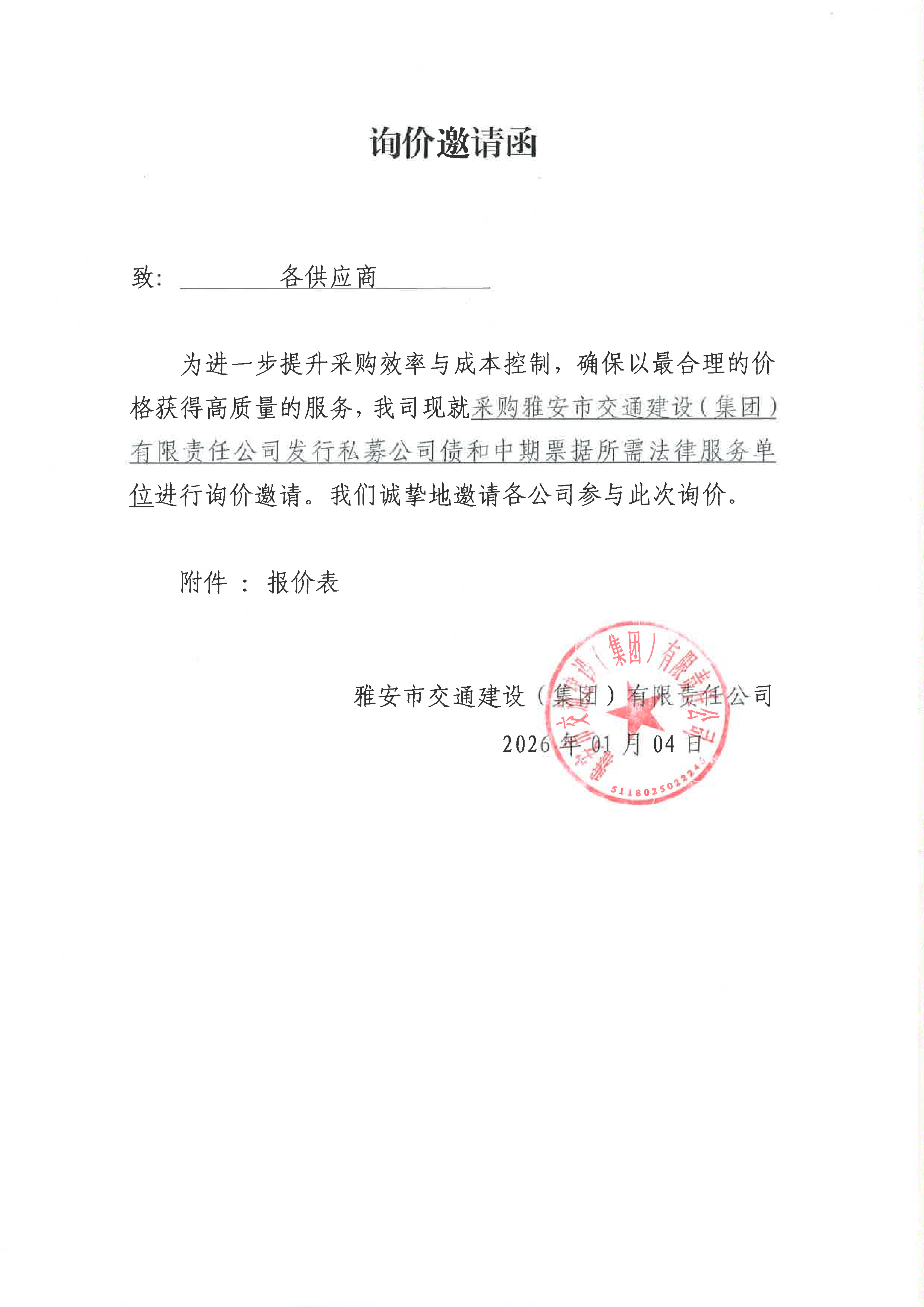 關(guān)于雅安市交通建設(shè)(集團)有限責(zé)任公司發(fā)行私募公司債和中期票據(jù)所需法律服務(wù)采購限價的詢價函