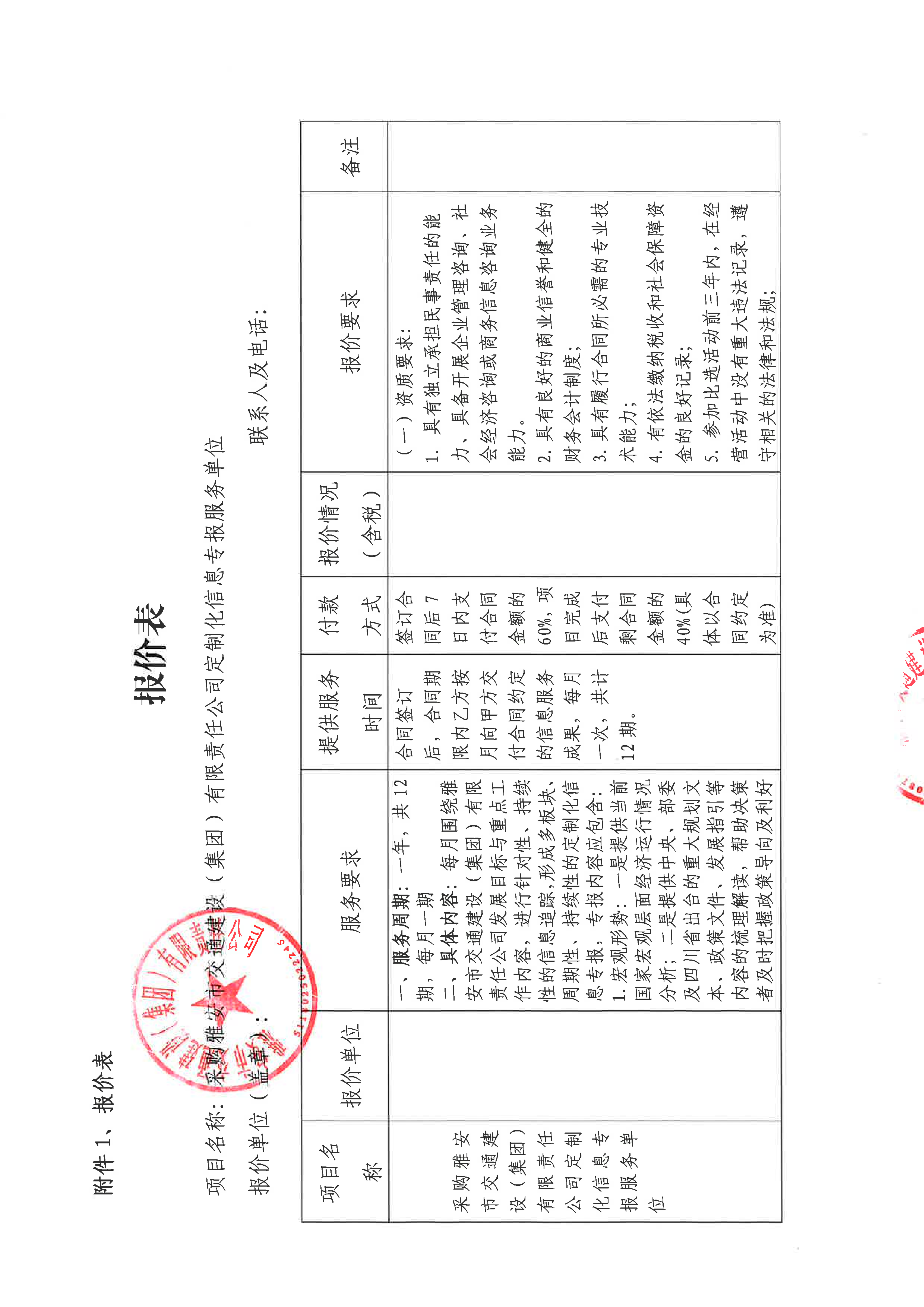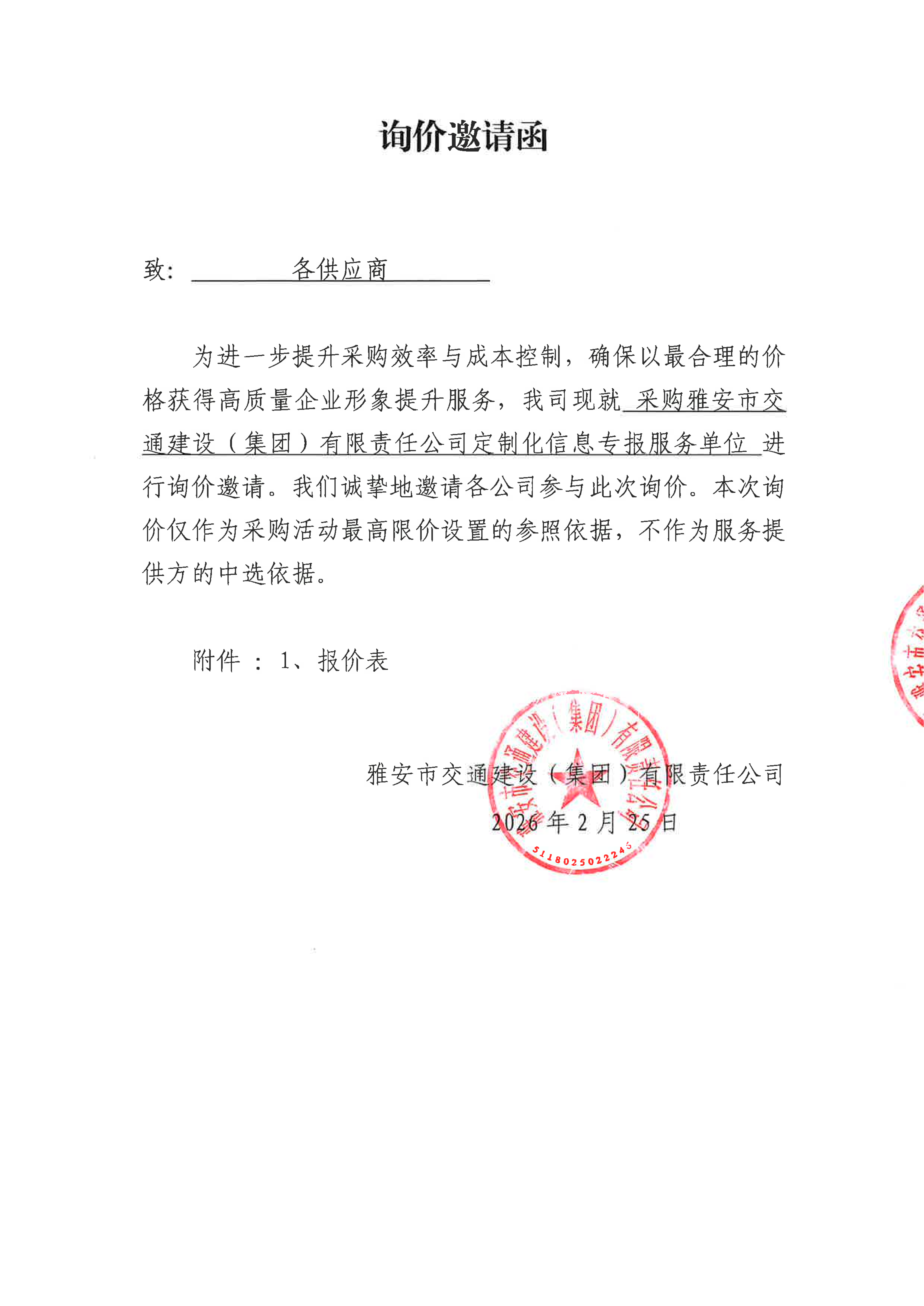 關(guān)于雅安市交通建設(shè)(集團(tuán))有限責(zé)任公司定制化信息專報(bào)服務(wù)采購(gòu)限價(jià)的詢價(jià)函