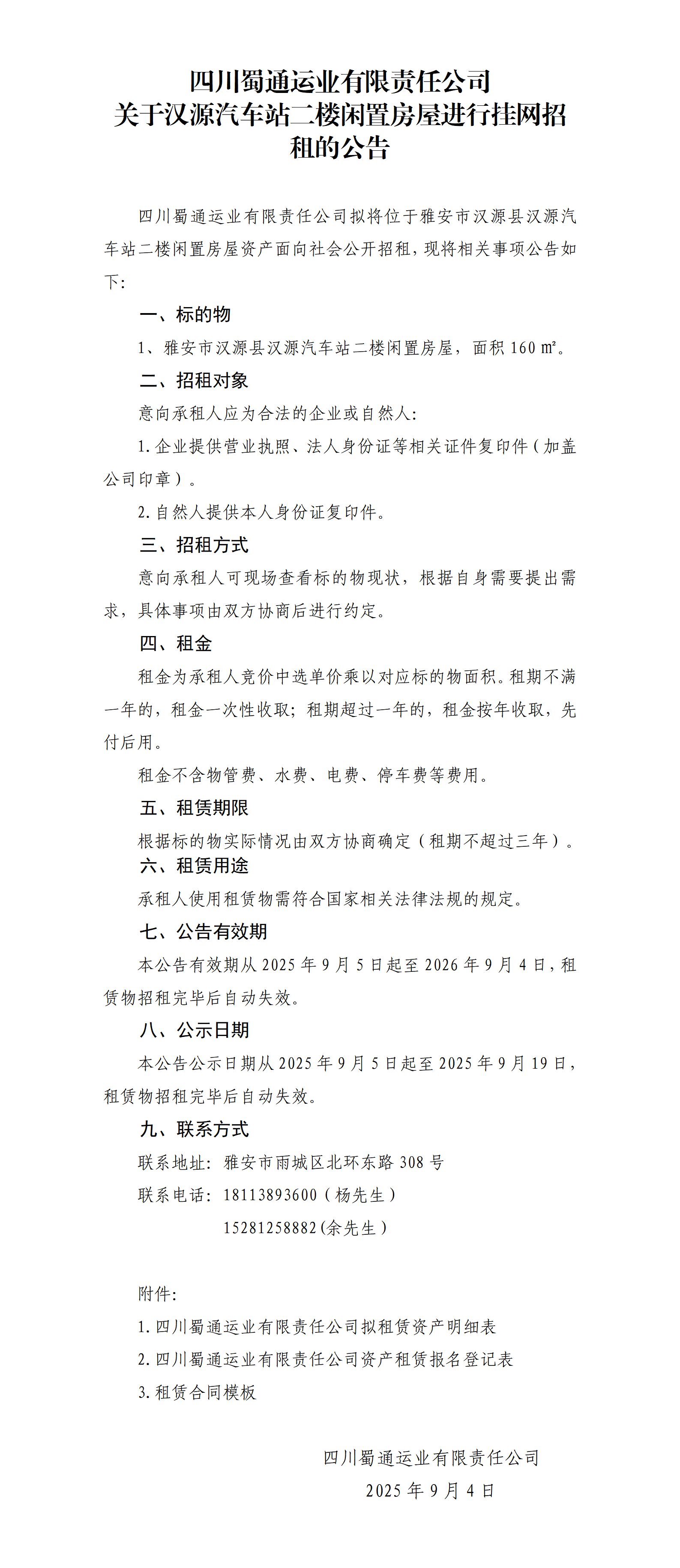 四川蜀通運業(yè)有限責任公司 關于漢源汽車站二樓閑置房屋進行掛網招租的公告