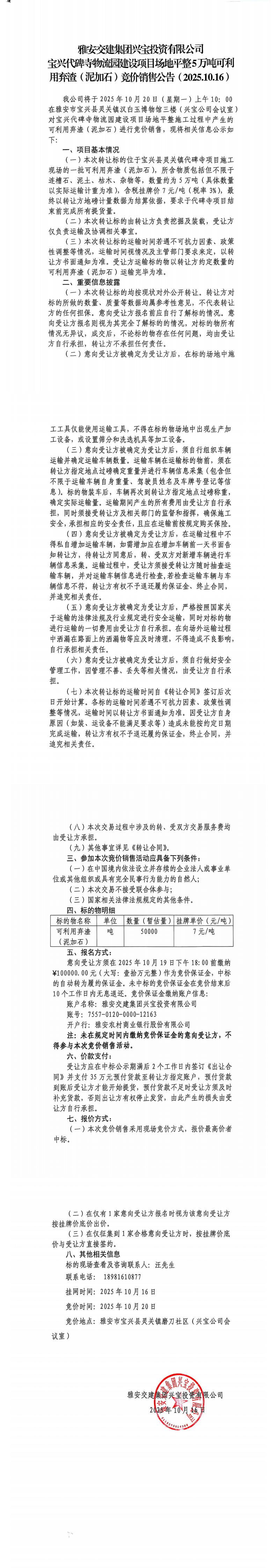 雅安交建集團(tuán)興寶投資有限公司寶興代碑寺物流園建設(shè)項(xiàng)目場地平整5萬噸可利用棄渣(精品)競價(jià)銷售公告(2025.10.16)